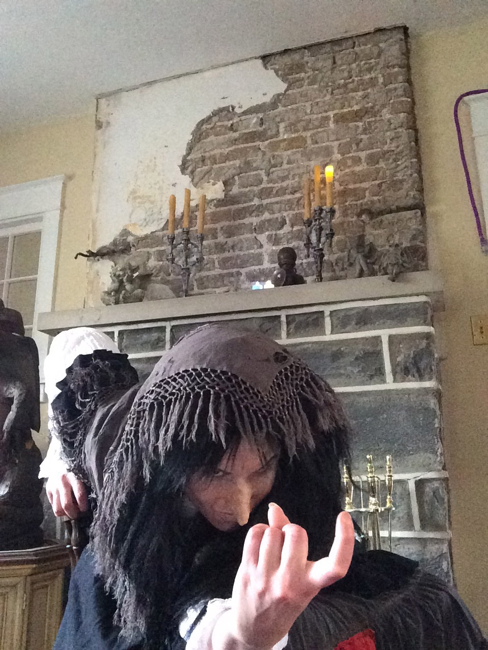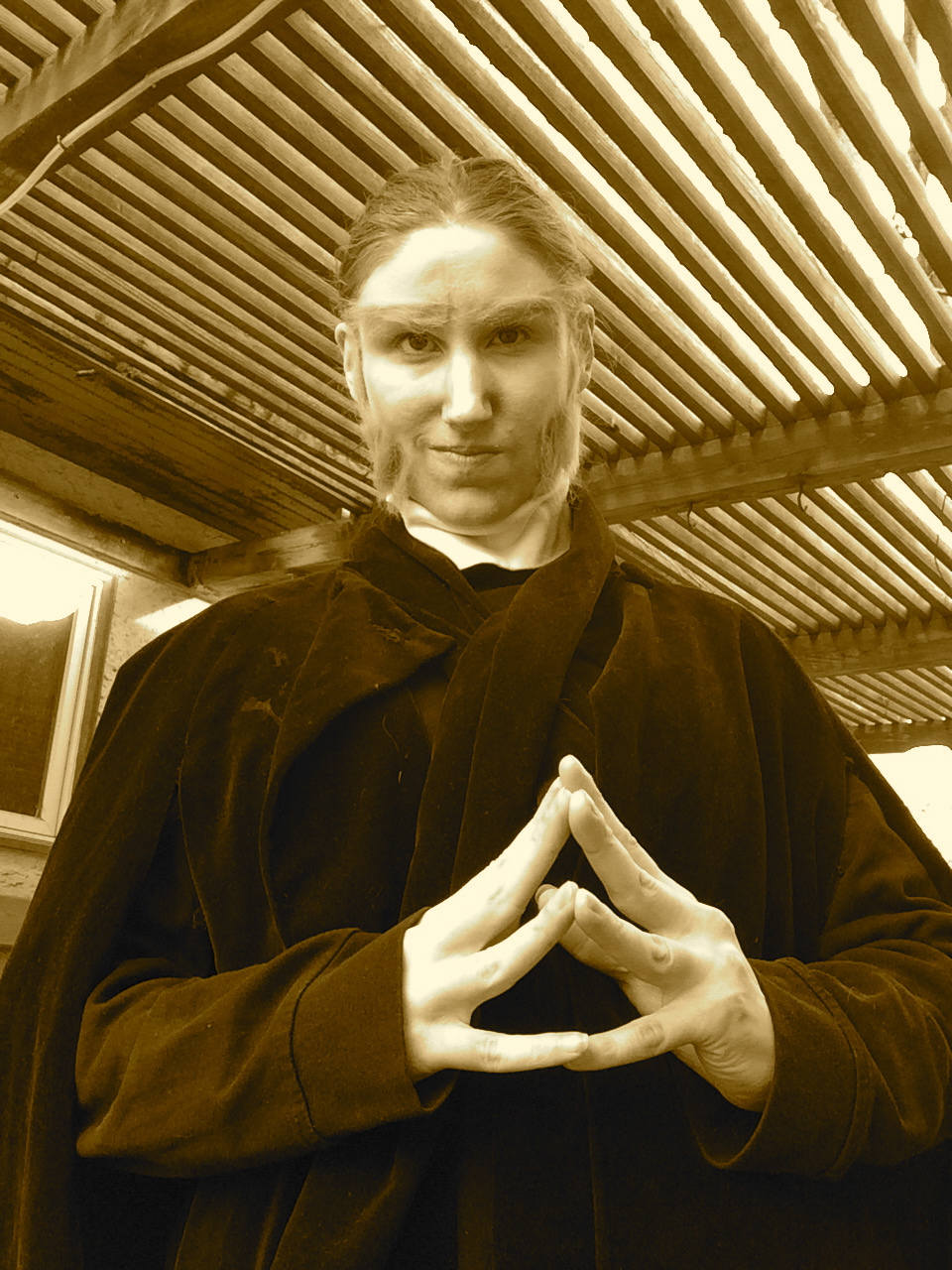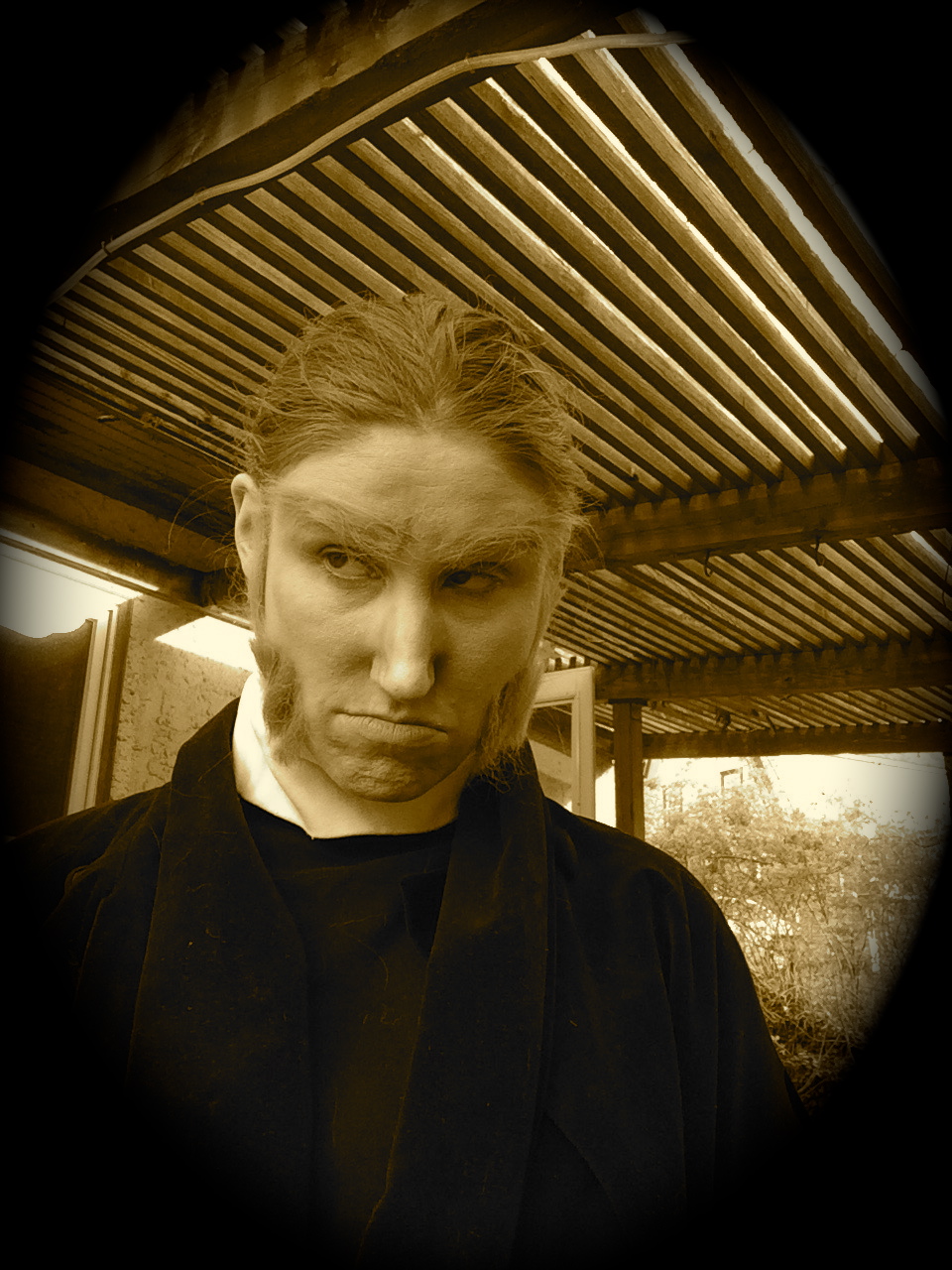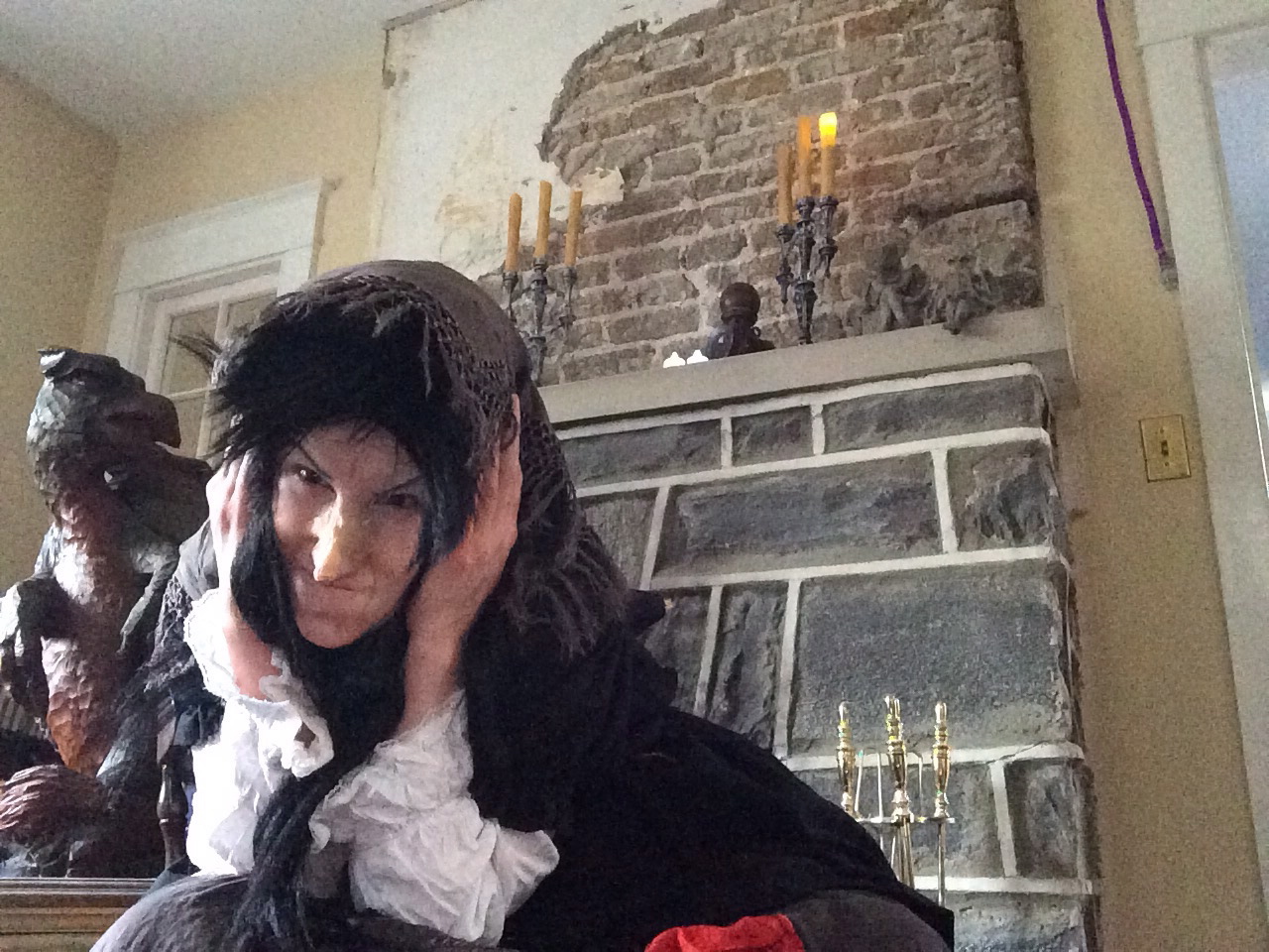 Ah, The Yeoman. This is another favorite of mine. I took the pictures in our front yard at night, and made Alec sit out with me, doing things on his computer, because I thought this might normalize things for anyone who happened to see me. “Auugh!” They would think. “What the hell is that?” And then they’d see Alec, composedly doing computer-stuff in the vicinity. “Ah,” they would say. “That guy isn’t worried about the ghost or crazy person or whatever. I will not worry either.”