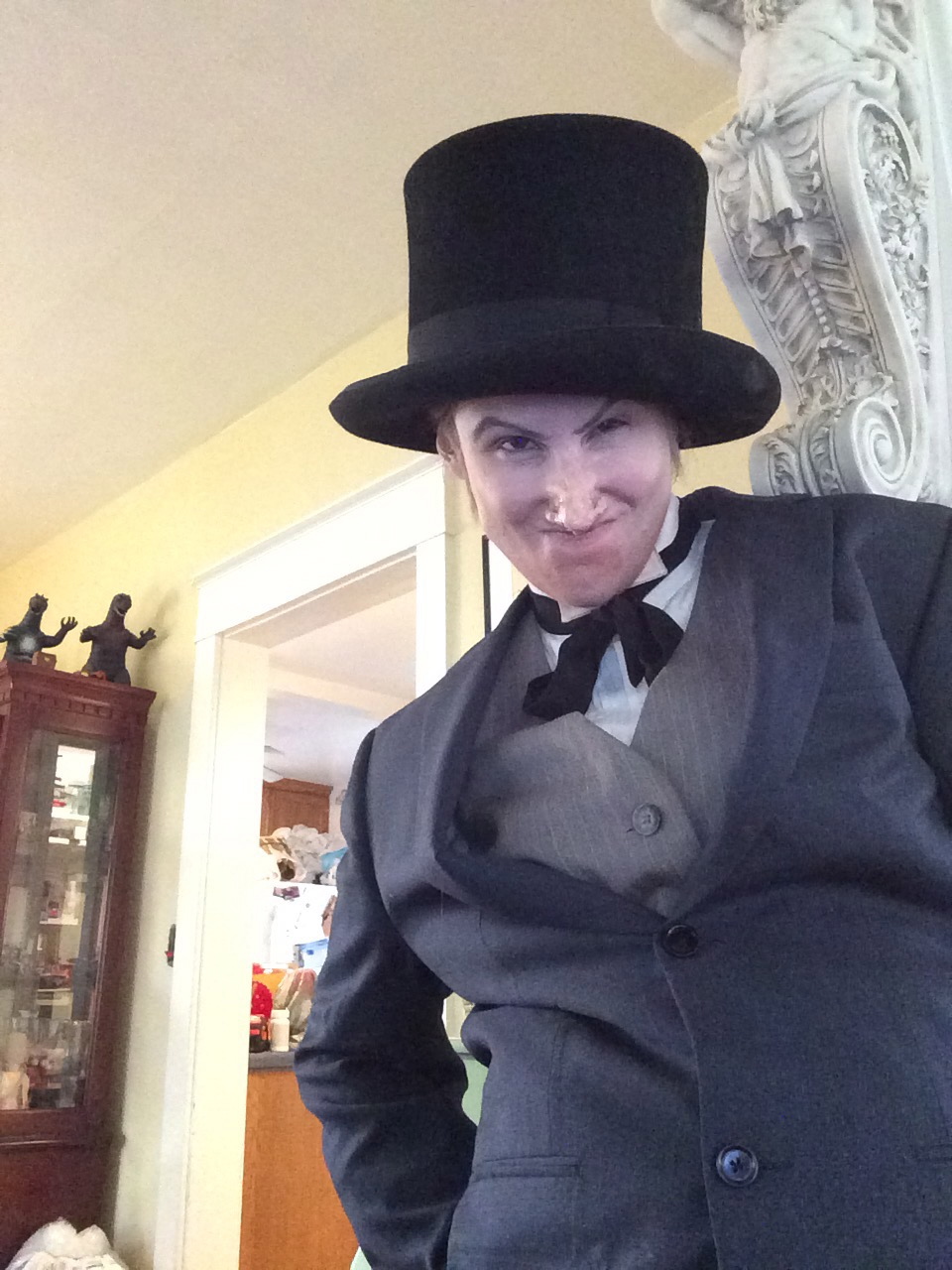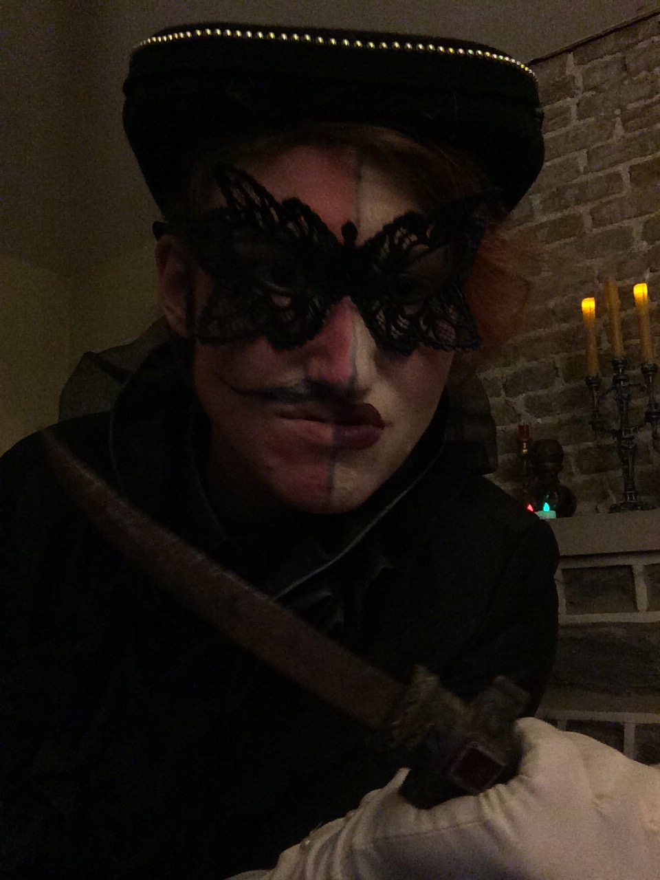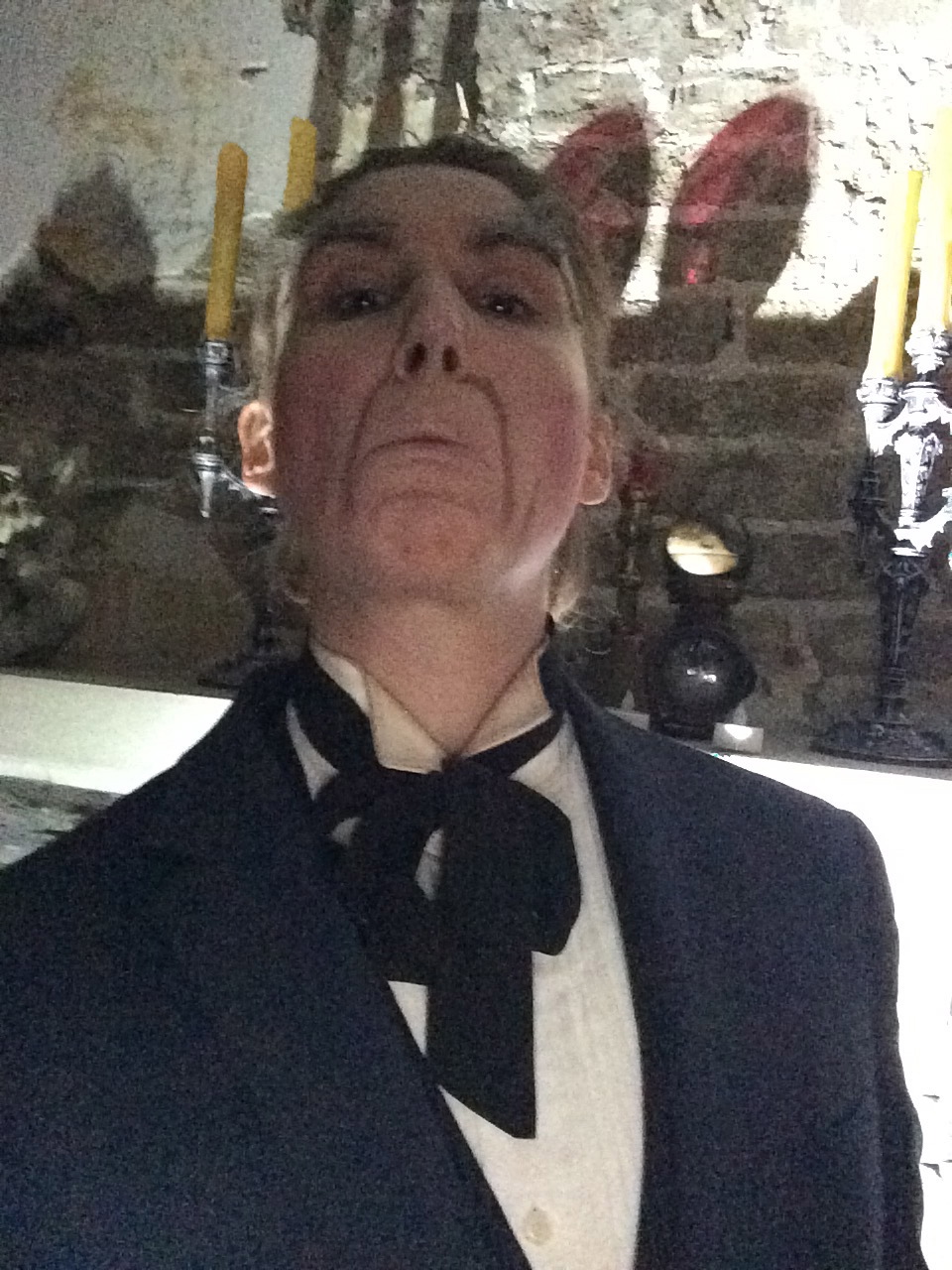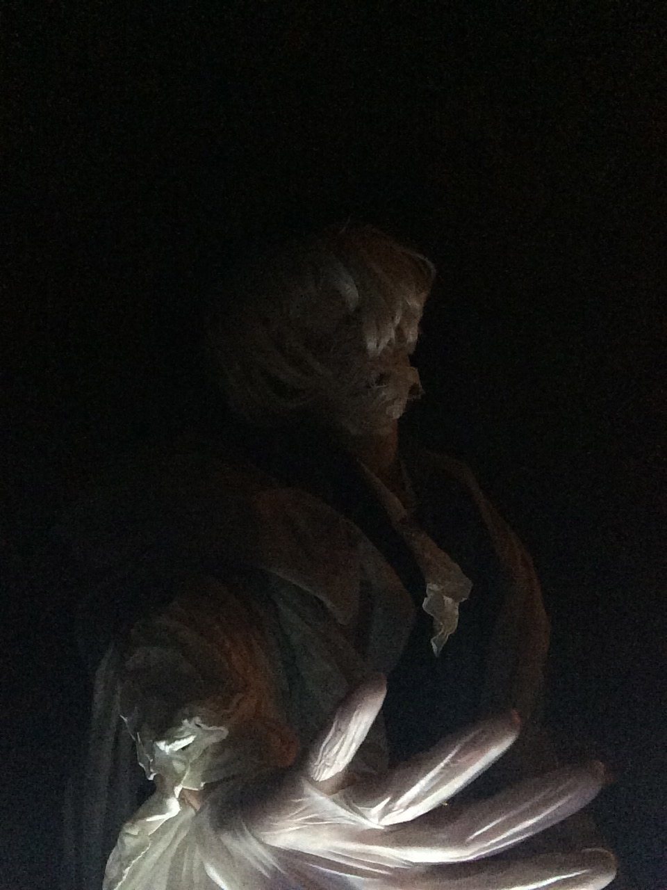 Ah, The Yeoman. This is another favorite of mine. I took the pictures in our front yard at night, and made Alec sit out with me, doing things on his computer, because I thought this might normalize things for anyone who happened to see me. “Auugh!” They would think. “What the hell is that?” And then they’d see Alec, composedly doing computer-stuff in the vicinity. “Ah,” they would say. “That guy isn’t worried about the ghost or crazy person or whatever. I will not worry either.”