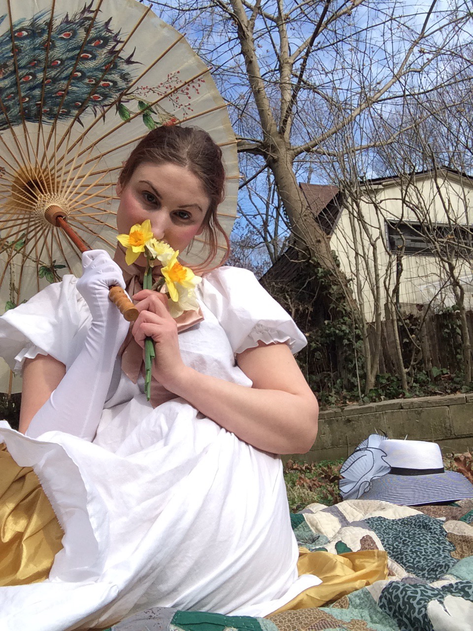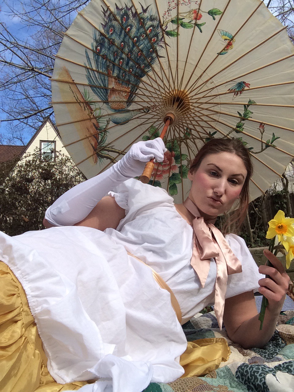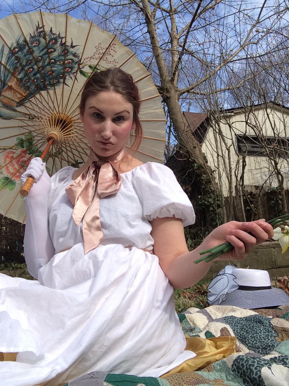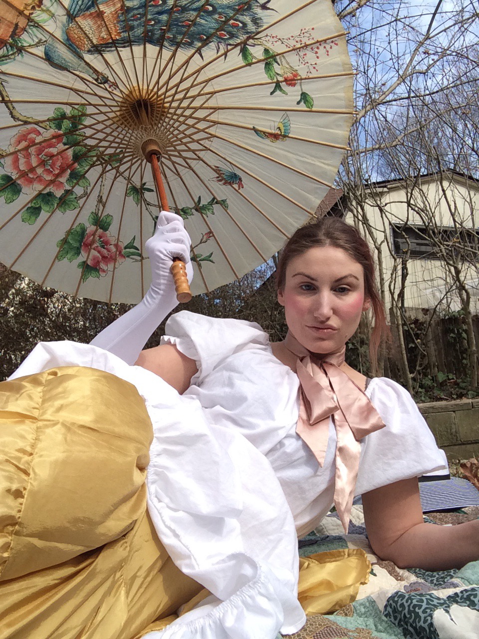 - How do you sprawl gracefully on a blanket with flowers and a parasol?