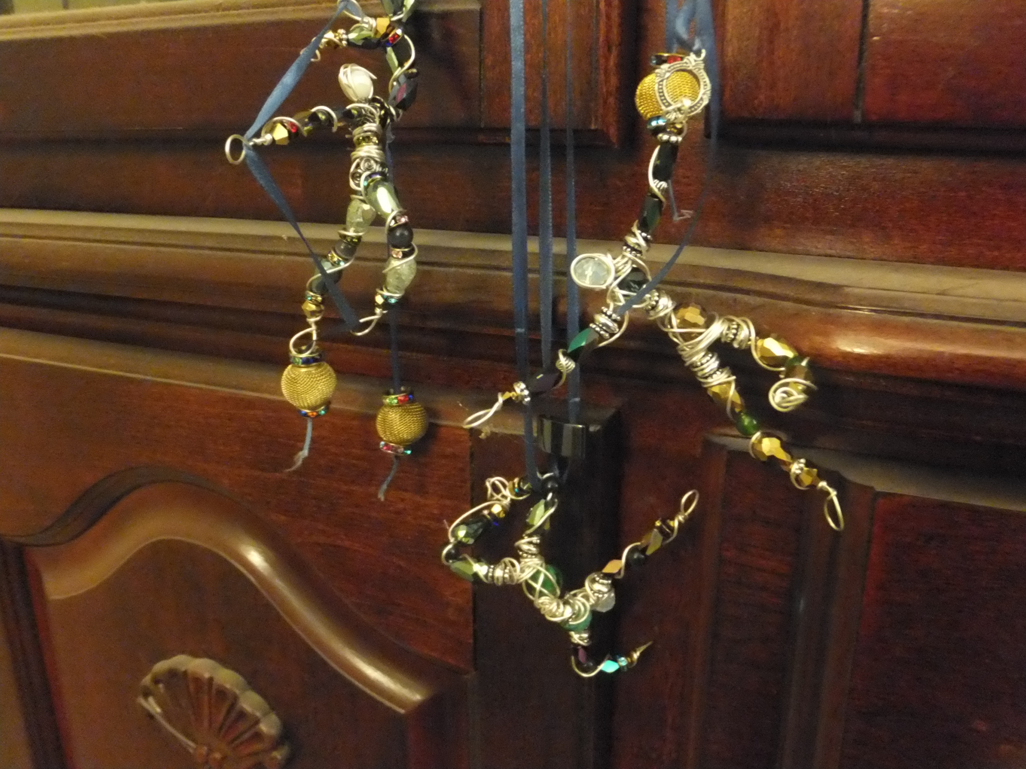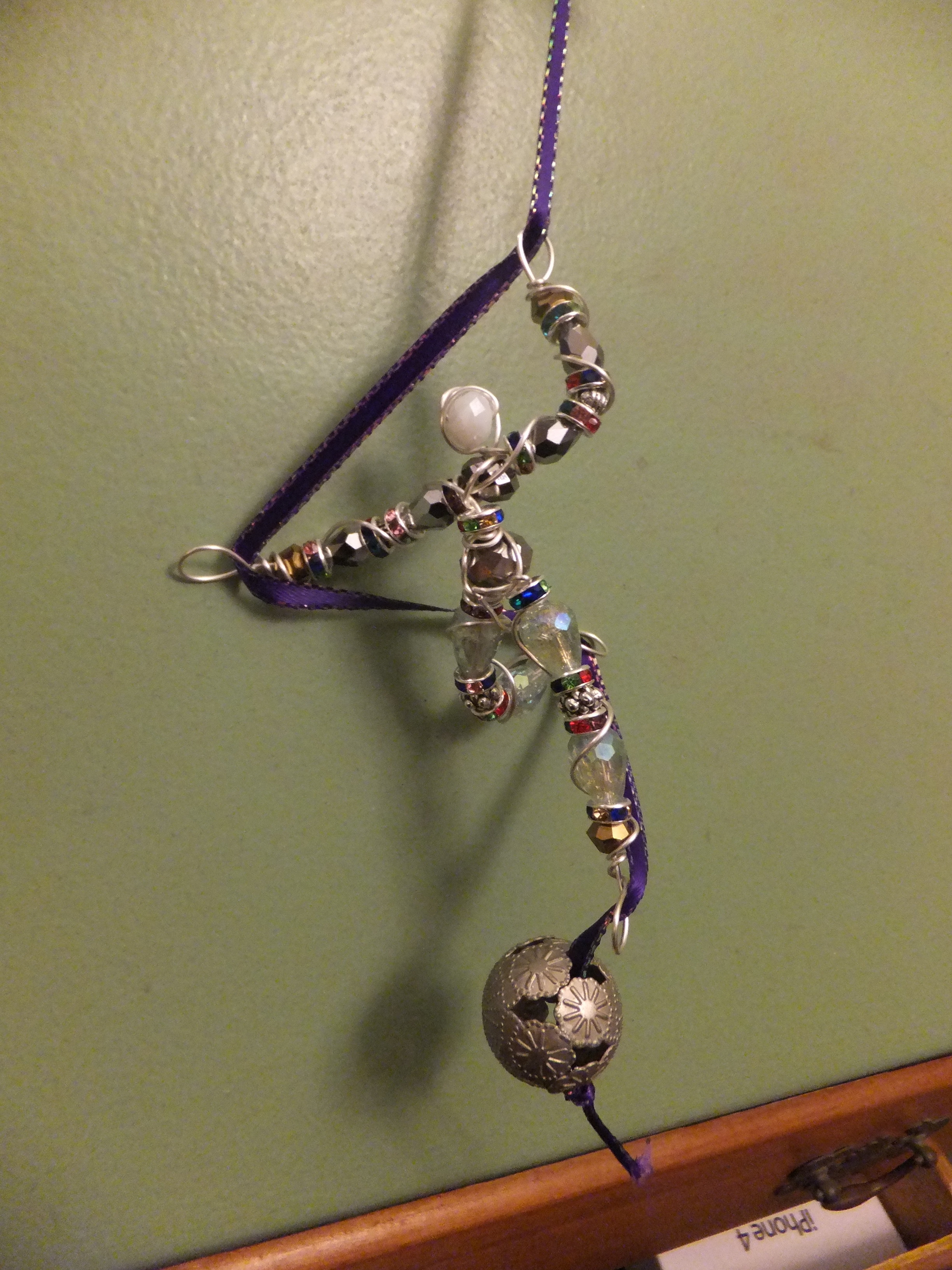 To make your doll into a Christmas ornament, pose your doll in some natural and dynamic position (think of how acrobats look while performing daring aerial feats), then feed a ribbon through the loops at the doll’s feet and hands until the doll clings to the ribbon like an awesome acrobat. Play with position of doll and position of ribbon until you get something that balances well and is visually pleasing. Then, put an ornament-hanging loop at one end of the ribbon (tie the ribbon to it) and put a big bead at the other end of the ribbon (knot the ribbon under the bead to keep the bead in place). And there are are! You have an ornament.